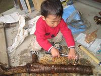 パパがドリルで穴を開け、私と花道が種駒をハンマーでとんとん(-“-;)