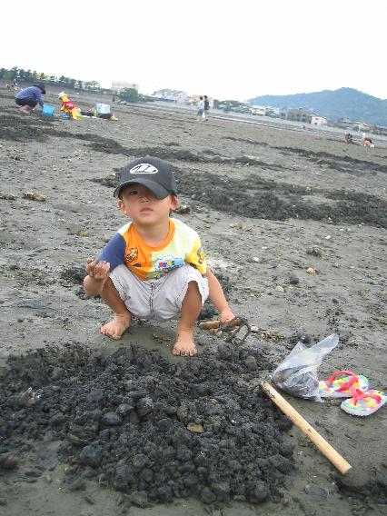 潮干狩りに到着(#^.^#)色んなところを掘って…やっと貝のあるところを発見(ё_ё)