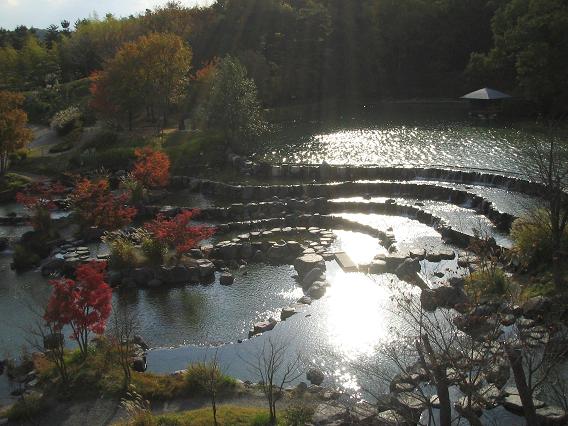 池の水が太陽にキラキラ光って、紅葉が燃えているように見えて+。:.゜